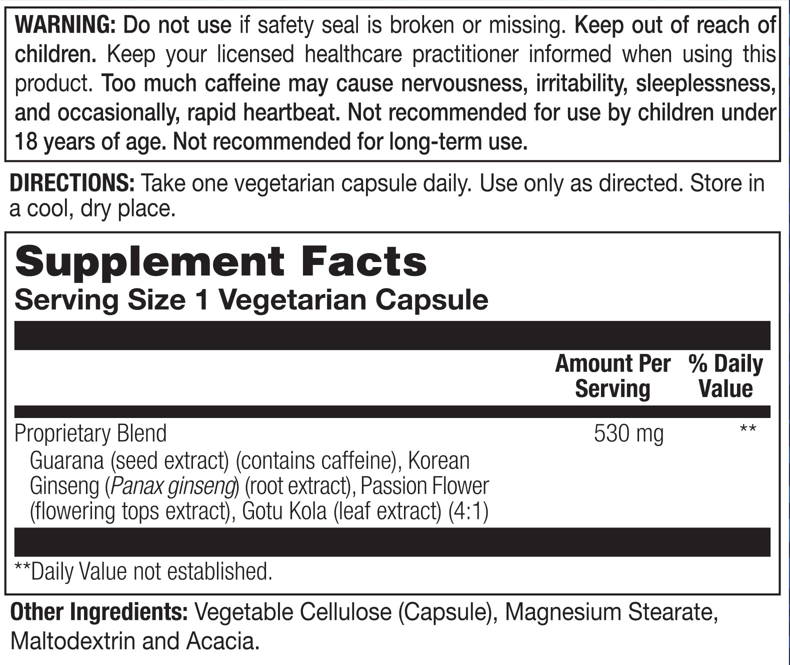 In addition to Guarana, this formula also incorporates a blend of complementary herbs including a concentrated Korean Ginseng Extract, Gotu Kola and Passion Flower.